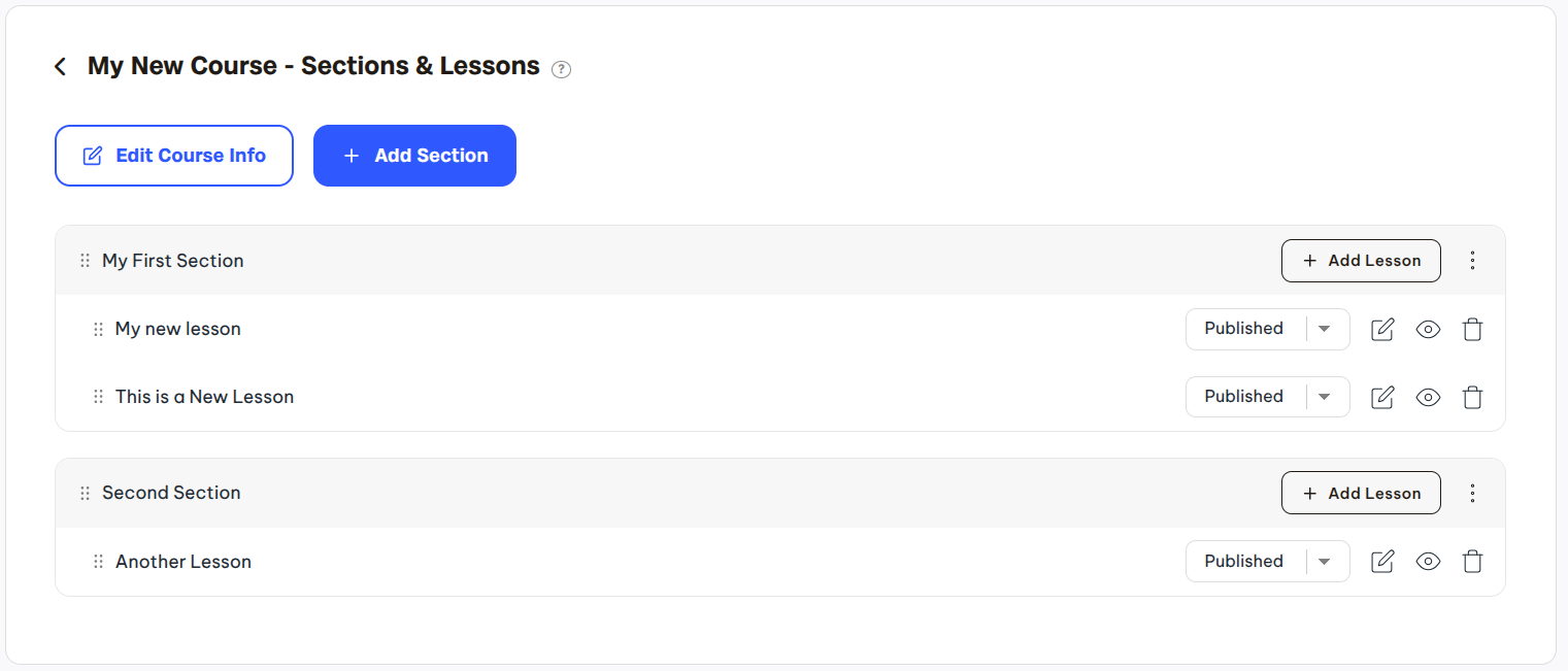 Lastly, you can move sections and lessons around to control the exact order you need to be used on the website. Simply click and hold onto the drag icon/indicator to move your sections or lessons.