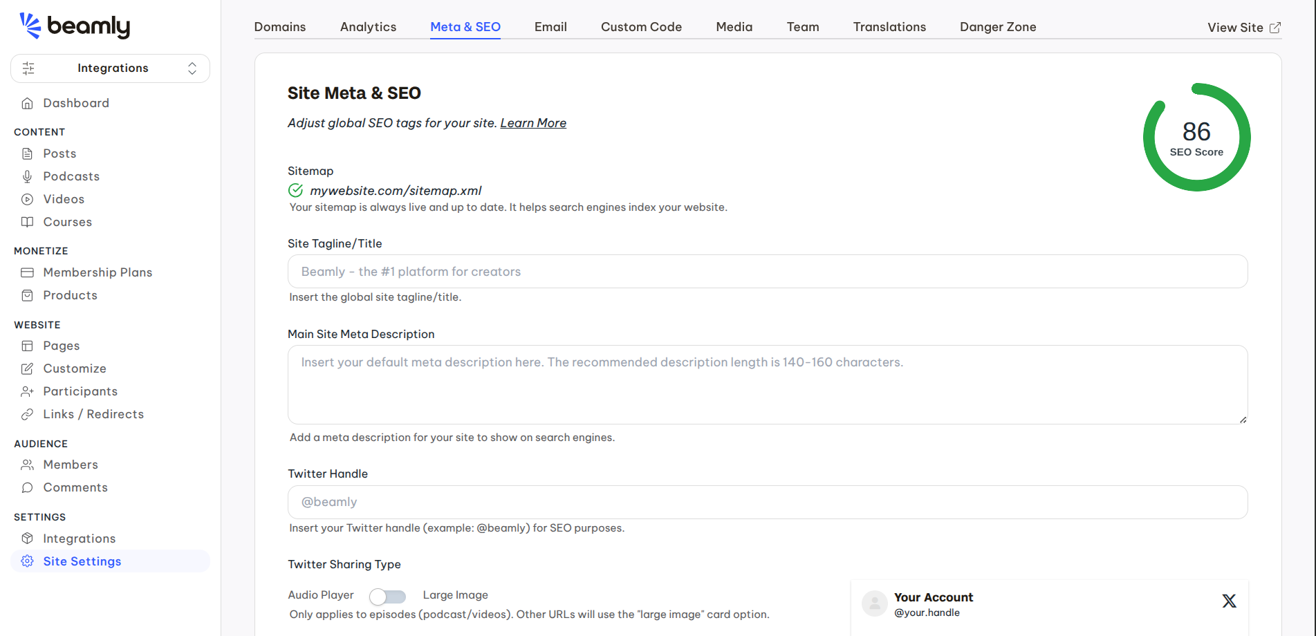 This section includes the default site title/tagline, meta description, social sharing images, site icon (favicon) and more. You can even set a custom robots.txt file or an ads.txt file to support a higher degree of customization, but remember this is an advanced setting to use it wisely.