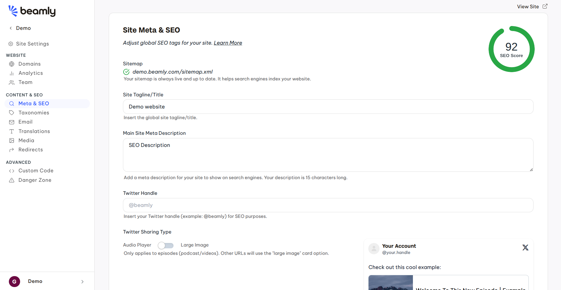 Meta & SEO - To make sure your website is fully optimized for SEO, we recommend that you add the site information, description and a default image to this section. This would help quite a bit in terms of improving your SEO score, and eventually getting your site ranked higher on search engines.