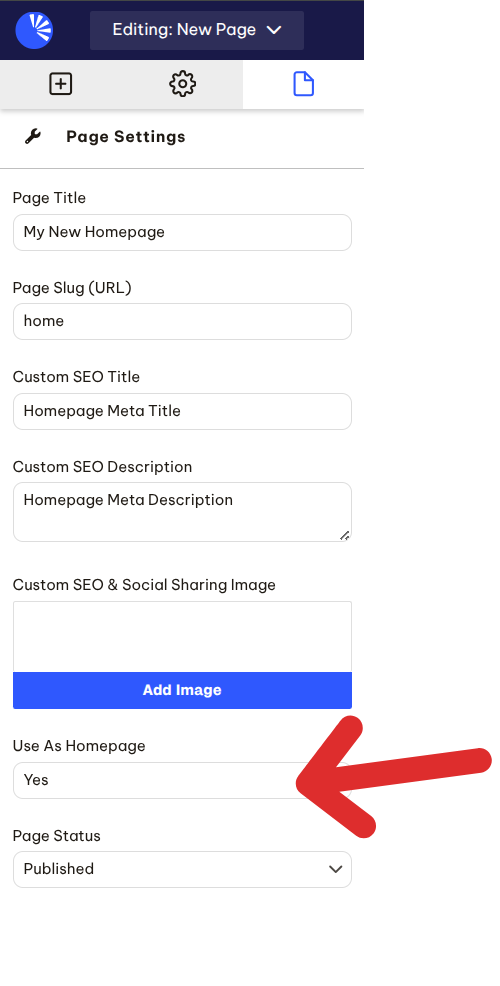 If you don't have a custom homepage set just yet, you can create a new one or assign any existing page to be your homepage via the Page Settings tab: