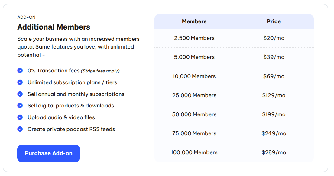 Beamly's Creator and Business plans come with a 1,000 member limit per website. This includes both free and paying members that are registered to your site.
