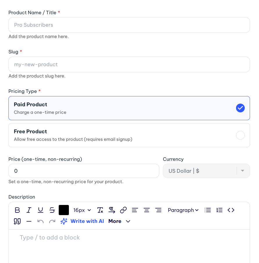 Products can be either free or paid. You have to Connect Stripe before creating new paid products. Once connected, you can add unlimited paid products. Each product can have its own pricing and offering.